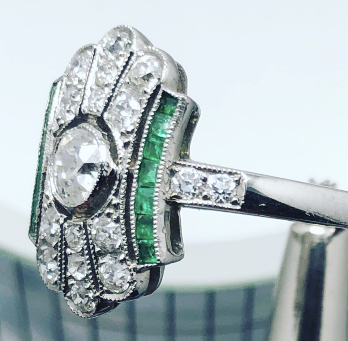 ArdenK Art deco circa unknown, magnificent timeless exquisite jewelry, Florence in mind, hand made in platinum by very talented masters , .80 carat total diamonds with special cut .30 carat total emeralds. ,