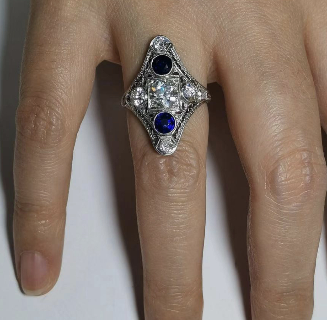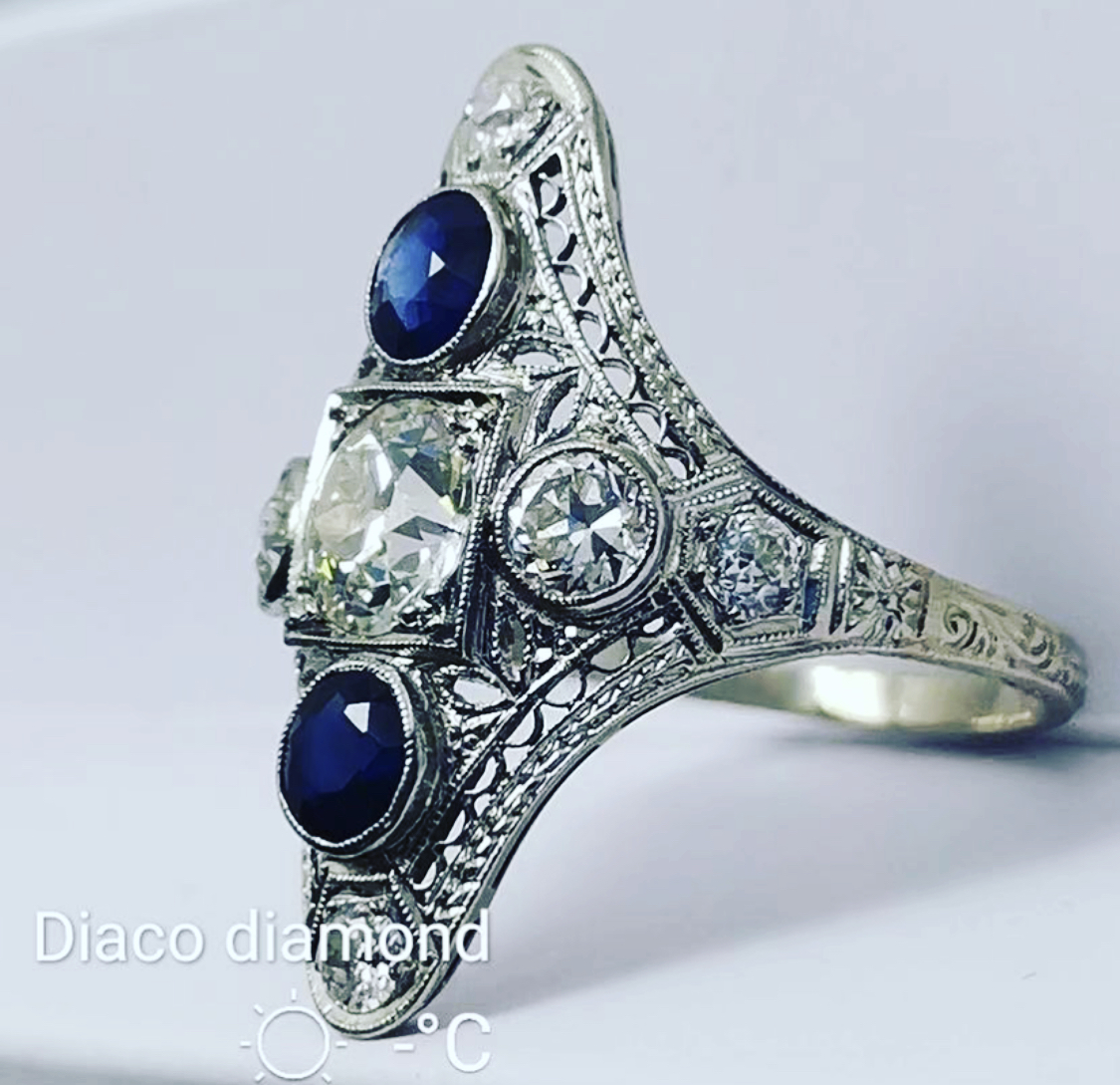 The Deneb Star Ring is an Art Deco Ring circa 1920! This ring has one center an old European cut diamond of approximately .65-.70 carat H-I color, SI1+ clarity. The diamond is decorated with round shape Sapphires. An additional 6 diamonds decorate the platinum setting with open metal work., exceptional hand engraving, total gem weight 1.90 carat, ring is size 7 and can be resized!