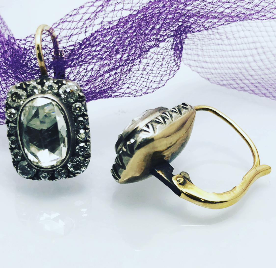 Hard to find Exquisite earring, 3.50 carat total weight 2center oval shape Rose Cuts approximately 2.60 carat diamond, diamonds on halo cluster around it about .90 carat., 14k yellow and silver metals mix earring, wearable for any event, from office to gala, simple yet elegant, what a great way to tell her. “love You”, on sale waiting for the lovely woman who will decorate herself with this magnificent piece of timeless jewelry.