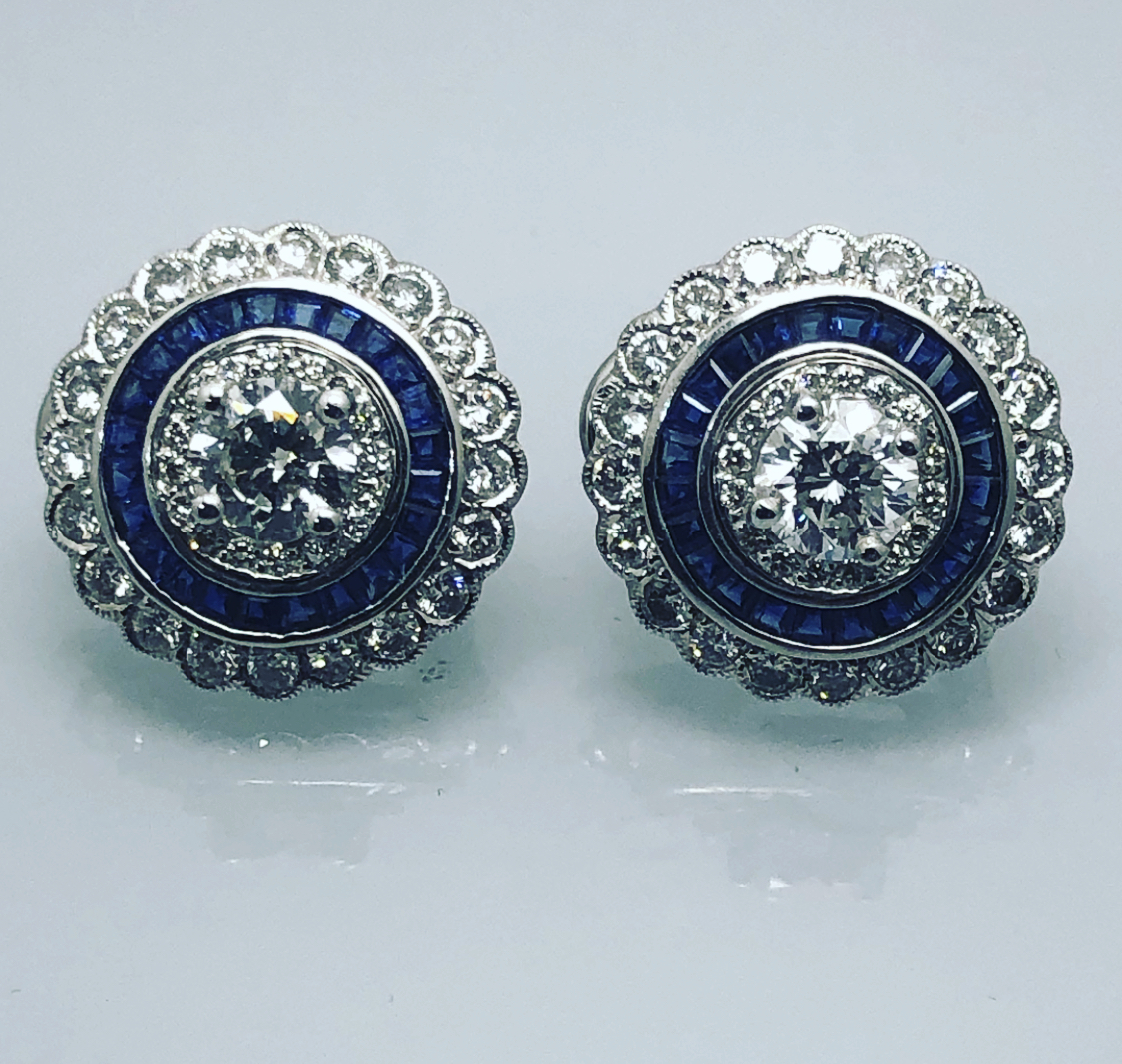 Elegant and graceful timeless amazing earring ,2 center diamonds approximately 1.16 tw clustered with custom cut sapphires approximately .80 tw . Eyes will be fixated on this immaculate 18k diamond earring, circa 1970-1980’s